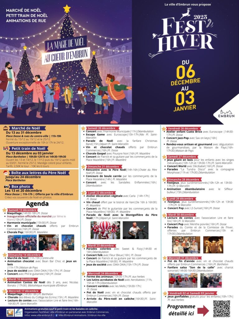 Embrun met le paquet à Noël ! Il y en a pour toute la famille : petit train de Noël pour visiter la ville historique, spectacles, concerts, chorales, animations, feu d’artifice, mais aussi patinoire pour s’adonner aux joies de la glisse en famille! Le principal est de s’amuser. Ensuite place au réconfort avec une bonne crêpe chaude au chocolat ou un vin chaud pour les plus grands.